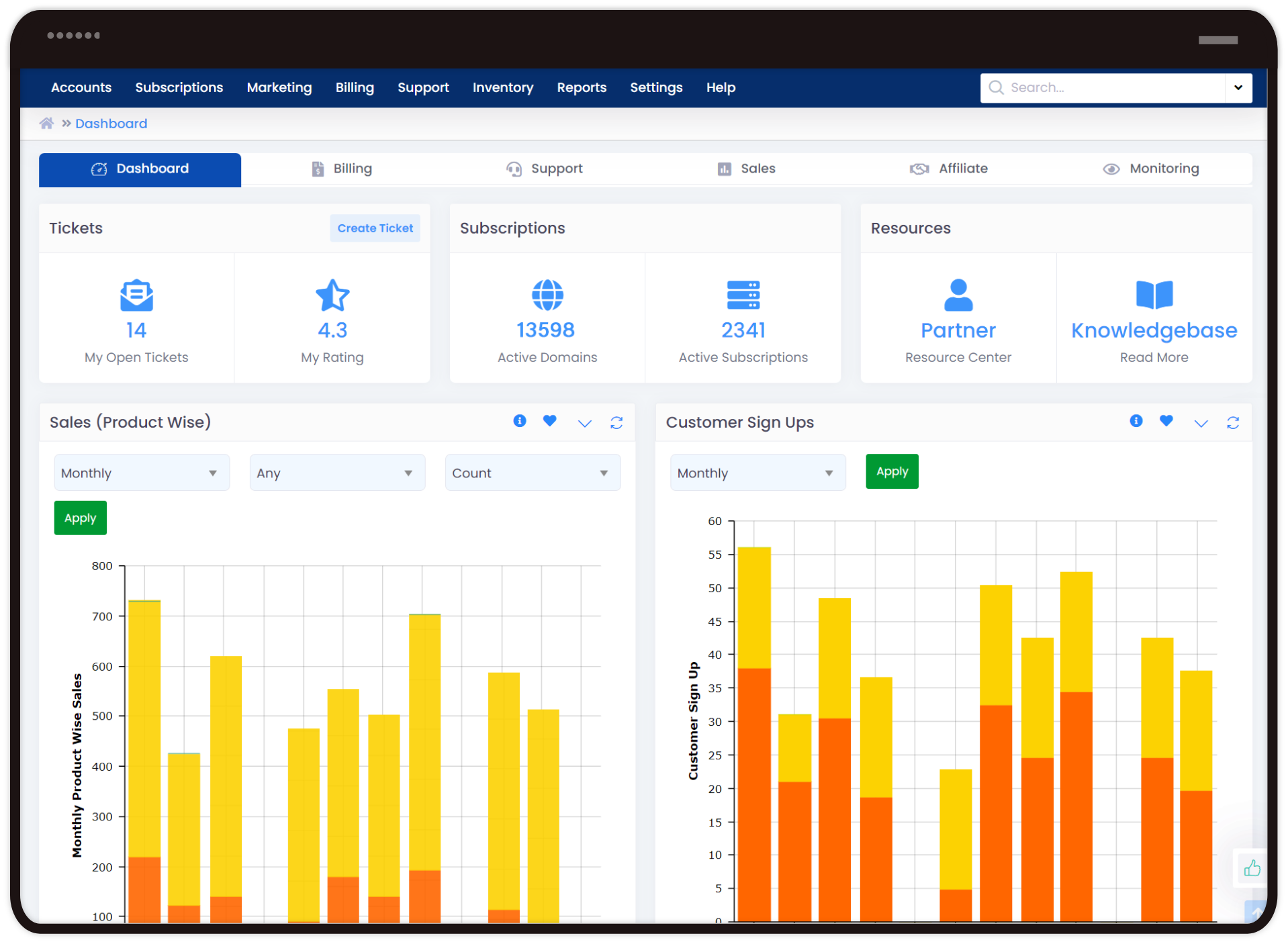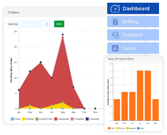 The user-friendly graphical dashboards provide comprehensive insights into upcoming payments, pending renewals, client ledgers, past orders, and more. It also offers you a holistic view of your customers' products and helps monitor partner performance effectively.