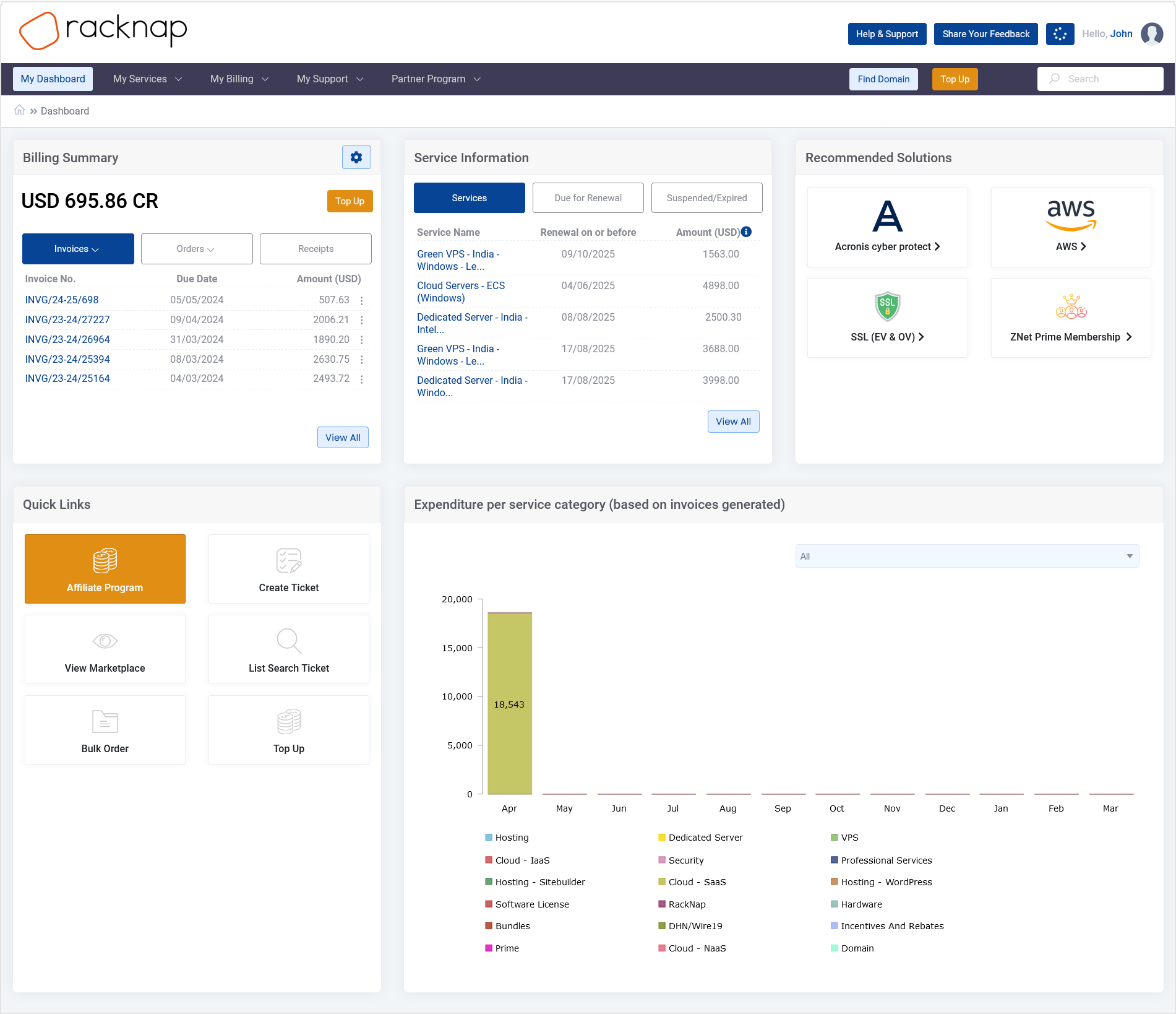 RackNap’s customer panel enables your clients to seamlessly access and manage their services. It gives them a complete overview of their services – they can view invoices, renew subscriptions, and create new orders.